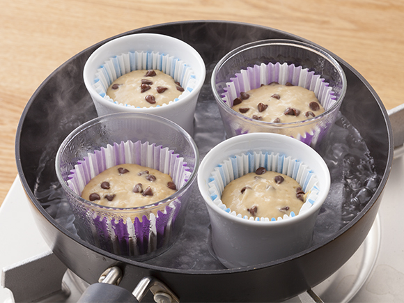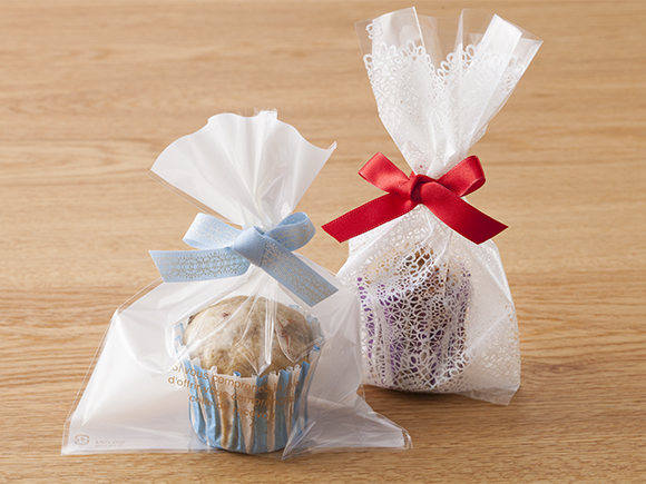 袋の上の方をぎゅっと握って絞り、セロハンテープなどでとめてリボンを結べば、かんたんにラッピングができます。竹串をさして、生地がつかなければ蒸し上がりです。火を使うときは、やけどをしないように注意してくださいね!※9号の紙カップ4個分です。※耐熱プリンカップを使用しております。