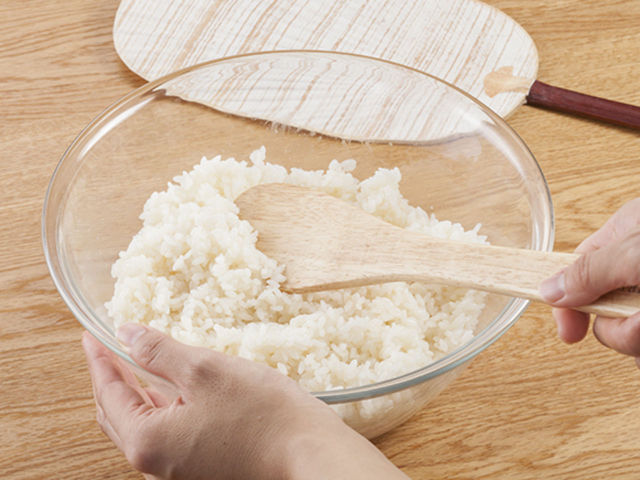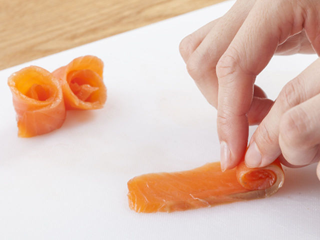 きれいに盛りつけやってみよう!!スモークサーモンをまな板の上に置いて、端からクルクルと巻いて、片方を花びらのように開けば、バラの花のでき上がりです!!包丁を使うときは手を切らないよう、気をつけて~!※調理時間以外に、炊飯に約1時間、炊いたご飯を冷ます時間に約30分かかります。