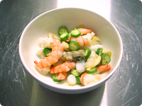 流水解凍したシーフードミックスと輪切りにしたオクラを電子レンジ600Wで1分30秒ほど加熱する。