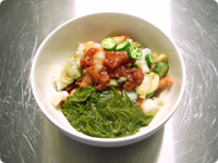 ①にめかぶ、種をとった梅干し、ポン酢をあわせる。・よく冷やした豆腐をつかうのがポイント。豆腐はめかぶと相性がよい絹ごしタイプがおすすめです。